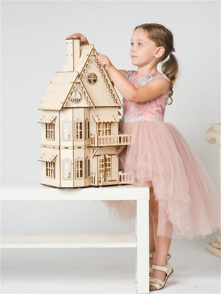 Габариты собранного изделия: высота 61 см, длина 35 см, глубина 21 см. Подходит для кукол до 15см, высота потолков 17см. Мебель вы можете приобрести отдельно. Материал домика - экологически чистый материал, компановка березовой фанеры и ХДФ. Домик состоит из 6 комнат. Внутри домика можно разместить мебель и предметы интерьера.