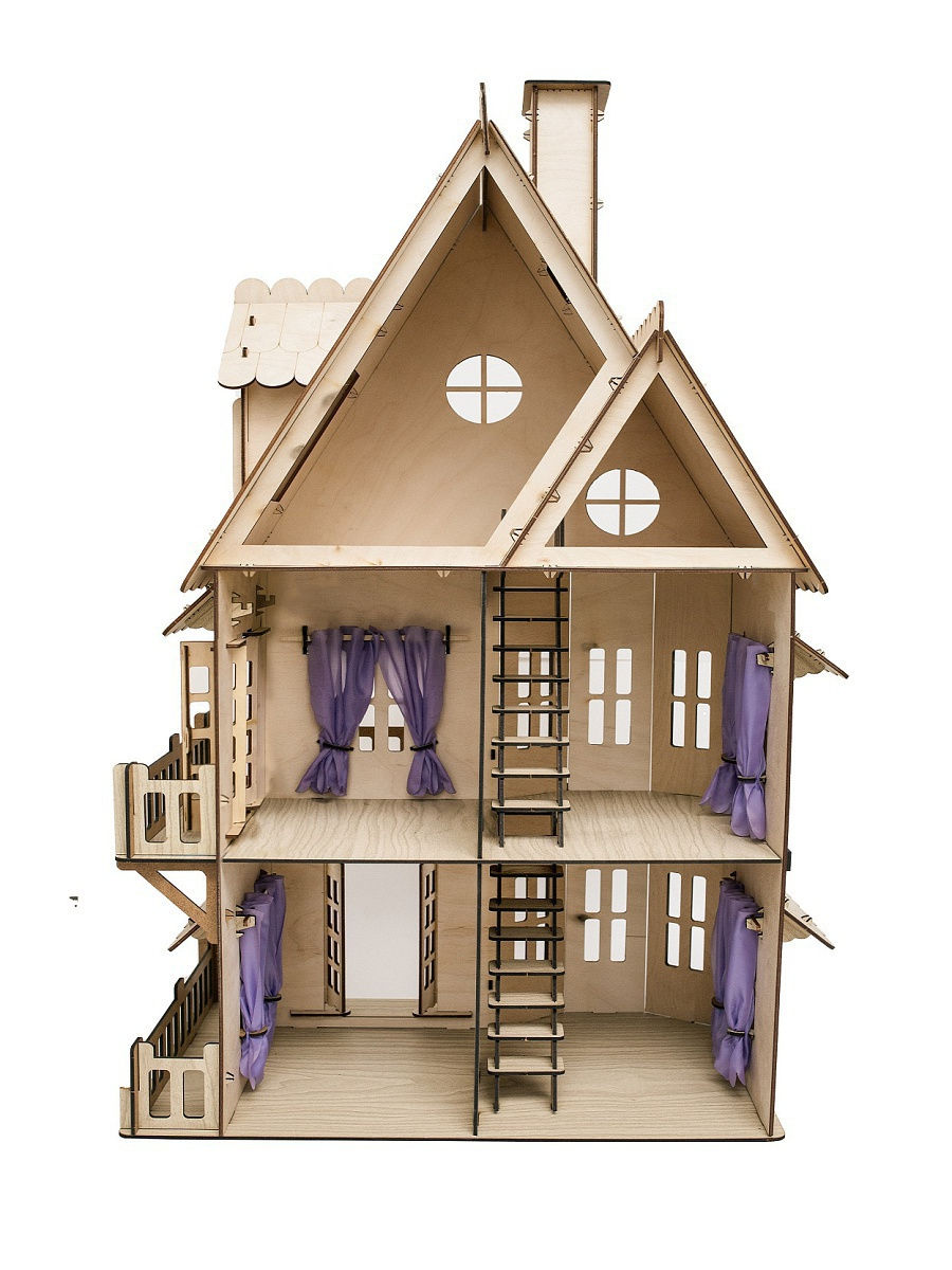 Габариты собранного изделия: высота 61 см, длина 35 см, глубина 21 см. Подходит для кукол до 15см, высота потолков 17см. Мебель вы можете приобрести отдельно. Материал домика - экологически чистый материал, компановка березовой фанеры и ХДФ. Домик состоит из 6 комнат. Внутри домика можно разместить мебель и предметы интерьера.