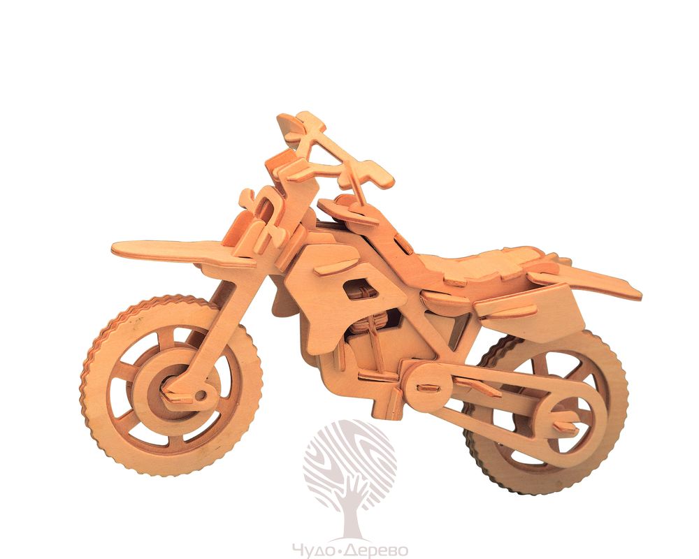 Сборная деревянная модель "Внедороpжный мотоцикл", артикул: P022. Комплект включает в себя набор деталей, вырезанных на листовом дереве (фанера); схему сборки; наждачную бумагу. Детали скрепляются в порядке и очередности, обозначенной в инструкции. Для прочности соединений рекомендуется использовать клей ПВА (не токсичен, не имеет запаха, после высыхания становится прозрачным, имеет эластичный клеевой шов, при загустевании может быть разбавлен водой). Возрастная ориентация: от 5 до 105 лет.