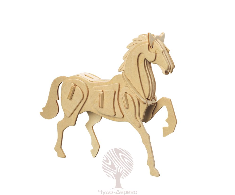 Сборная деревянная модель "Лошадь", артикул: E023. Комплект включает в себя набор деталей, вырезанных на листовом дереве (фанера); схему сборки; наждачную бумагу. Детали скрепляются в порядке и очередности, обозначенной в инструкции. Для прочности соединений рекомендуется использовать клей ПВА (не токсичен, не имеет запаха, после высыхания становится прозрачным, имеет эластичный клеевой шов, при загустевании может быть разбавлен водой). Возрастная ориентация: от 5 до 105 лет.