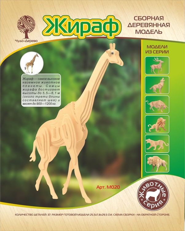 Сборная деревянная модель "Жираф", артикул: M020. Комплект включает в себя набор деталей, вырезанных на листовом дереве (фанера); схему сборки; наждачную бумагу. Детали скрепляются в порядке и очередности, обозначенной в инструкции. Для прочности соединений рекомендуется использовать клей ПВА (не токсичен, не имеет запаха, после высыхания становится прозрачным, имеет эластичный клеевой шов, при загустевании может быть разбавлен водой). Возрастная ориентация: от 5 до 105 лет.